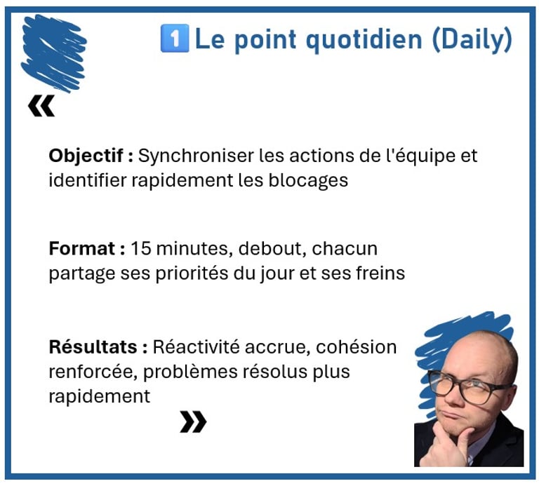 Objectif : Synchroniser les actions de l'équipe et identifier rapidement les blocages Format : 15 minutes, debout, chacun partage ses priorités du jour et ses freins Résultats : Réactivité accrue, cohésion renforcée, problèmes résolus plus rapidement