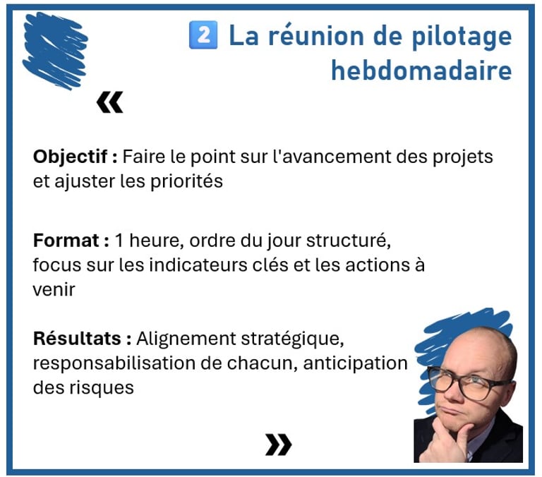 Objectif : Faire le point sur l'avancement des projets et ajuster les priorités Format : 1 heure, ordre du jour structuré, focus sur les indicateurs clés et les actions à venir Résultats : Alignement stratégique, responsabilisation de chacun, anticipation des risques