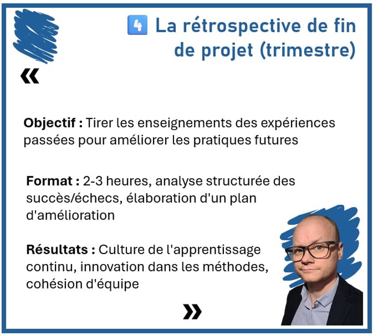 Objectif : Tirer les enseignements des expériences passées pour améliorer les pratiques futures Format : 2-3 heures, analyse structurée des succès/échecs, élaboration d'un plan d'amélioration Résultats : Culture de l'apprentissage continu, innovation dans les méthodes, cohésion d'équipe