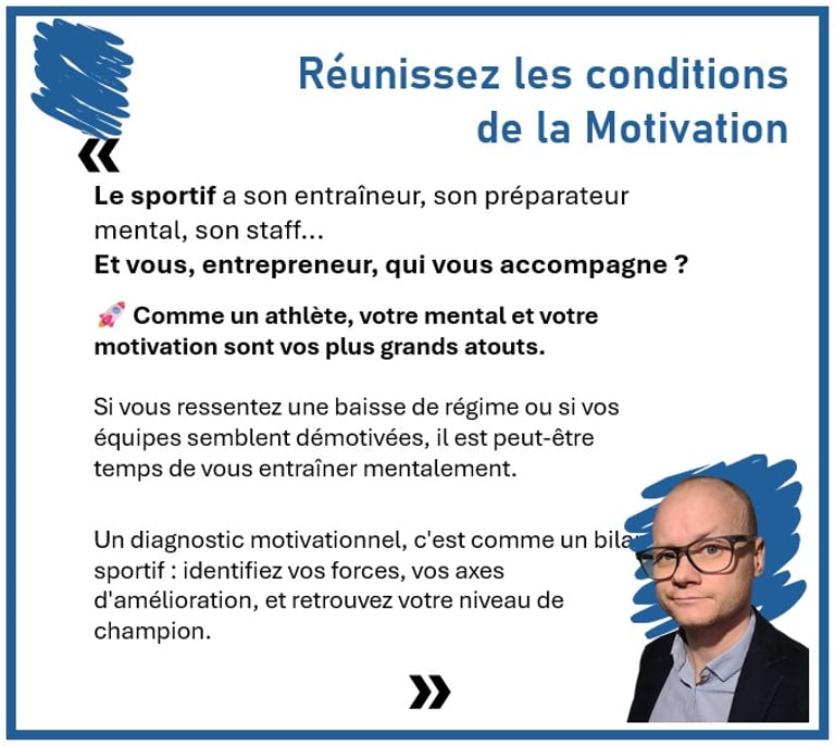 Et vous, entrepreneur, qui vous accompagne mentalement ?🚀 Comme un athlète, votre mental est votre plus grand atout.Si vous ressentez une baisse de régime ou si vos équipes semblent démotivées, il est peut-être temps de vous entraîner mentalement.Un diagnostic motivationnel, c'est comme un bilan sportif : identifier vos forces, vos axes d'amélioration, et retrouver votre niveau de champion.