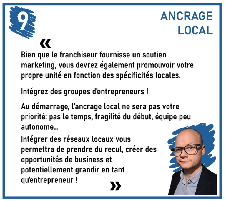 9.Ancrage local : Bien que le franchiseur fournisse un soutien marketing, vous devrez également promouvoir votre propre unité en fonction des spécificités locales.
