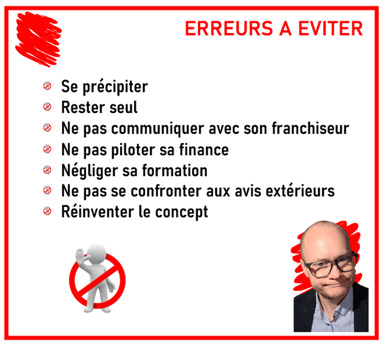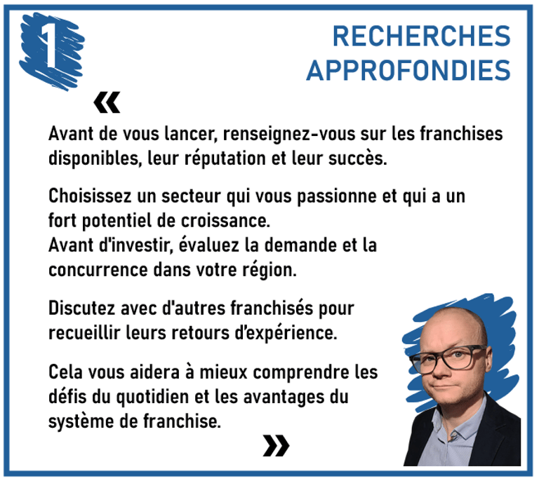 1.Faire des recherches approfondies & Analyser le marché local & Consulter les autres franchisés : Avant de vous lancer, renseignez-vous sur les franchises disponibles, leur réputation et leur succès. Choisissez un secteur qui vous passionne et qui a un fort potentiel de croissance. Avant d'investir, évaluez la demande et la concurrence dans votre région. Un bon emplacement est crucial pour la réussite de votre franchise. Discutez avec d'autres franchisés pour recueillir leurs retours d’expérience. Cela vous aidera à mieux comprendre les défis du quotidien et les avantages du système de franchise.