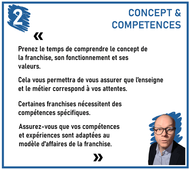 2.Évaluer vos compétences & Comprendre le concept : Assurez-vous que vos compétences et expériences sont adaptées au modèle d'affaires de la franchise. Certaines franchises nécessitent des compétences spécifiques. Prenez le temps de comprendre le concept de la franchise, son fonctionnement et ses valeurs. Cela vous permettra de vous assurer que cela correspond à vos attentes.