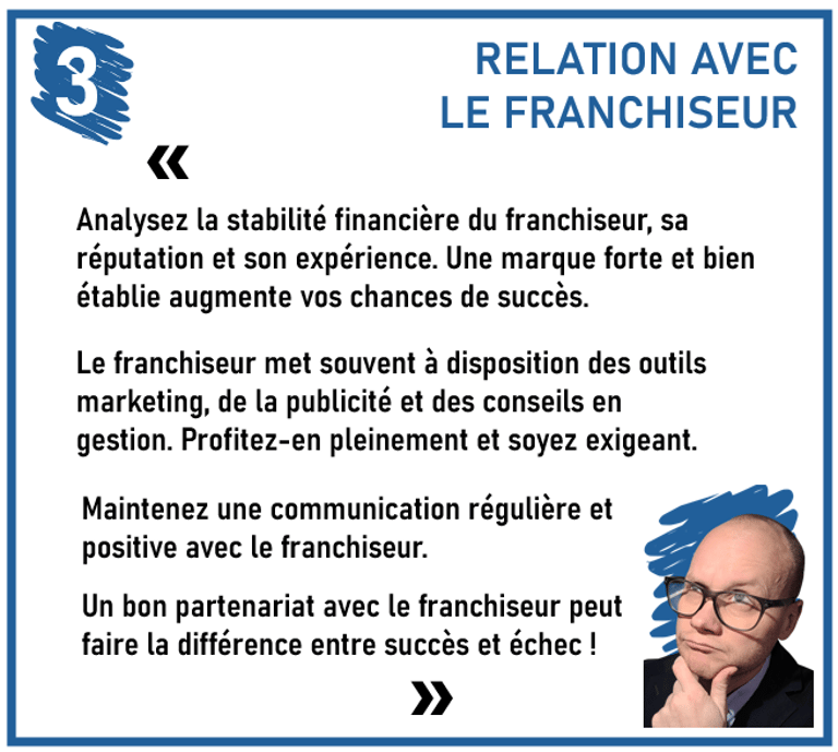 3.Vérifier la solidité du franchiseur : Analysez la stabilité financière du franchiseur, sa réputation et son expérience. Une marque forte et bien établie augmente vos chances de succès.Tirer parti du soutien du franchiseur : Le franchiseur met souvent à disposition des outils marketing, de la publicité et des conseils en gestion. Profitez-en pleinement. Entretenir une relation étroite avec le franchiseur : Maintenez une communication régulière et positive avec le franchiseur. Un bon partenariat avec le franchiseur peut faire la différence entre succès et échec.