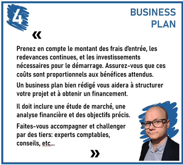 4.Évaluer les frais de franchise : Prenez en compte le montant des frais d’entrée, les redevances continues, et les investissements nécessaires pour le démarrage. Assurez-vous que ces coûts sont proportionnels aux bénéfices attendus. Préparer un business plan solide : Un business plan bien rédigé vous aidera à structurer votre projet et à obtenir un financement. Il doit inclure une étude de marché, une analyse financière et des objectifs précis.