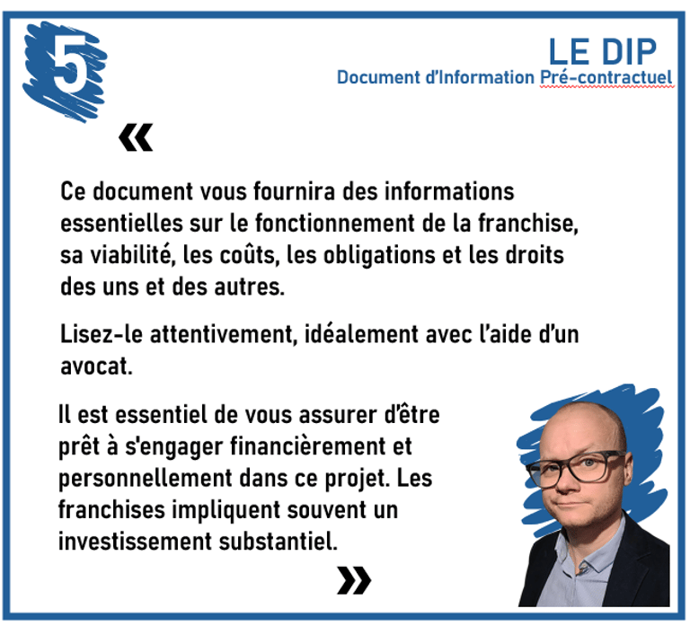 5.Lire le document d'information précontractuelle (DIP) Analyser les performances passées : Ce document vous fournira des informations essentielles sur le fonctionnement de la franchise, les obligations et les droits. Lisez-le attentivement, idéalement avec l’aide d’un avocat. Vérifiez les performances financières de la franchise. Les chiffres d’affaires des unités existantes vous donnent une idée du potentiel de rentabilité.