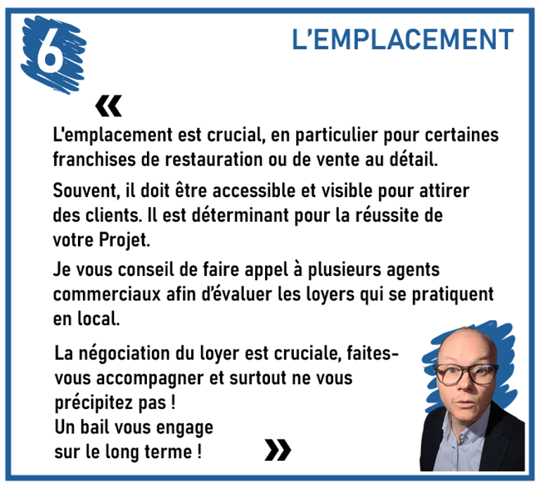 6.Choisir un bon emplacement : L'emplacement est crucial, en particulier pour certaines franchises de restauration ou de vente au détail. Il doit être accessible et visible pour attirer des clients.