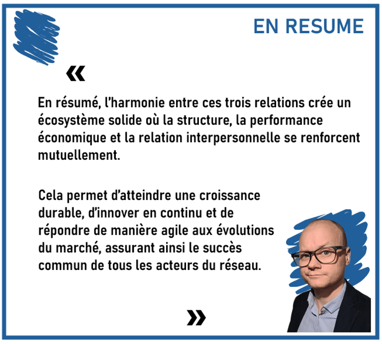 En résumé, l’harmonie entre ces trois relations crée un écosystème solide où la structure, la performance économique et la relation interpersonnelle se renforcent mutuellement. Cela permet d’atteindre une croissance durable, d’innover en continu et de répondre de manière agile aux évolutions du marché, assurant ainsi le succès commun de tous les acteurs du réseau.