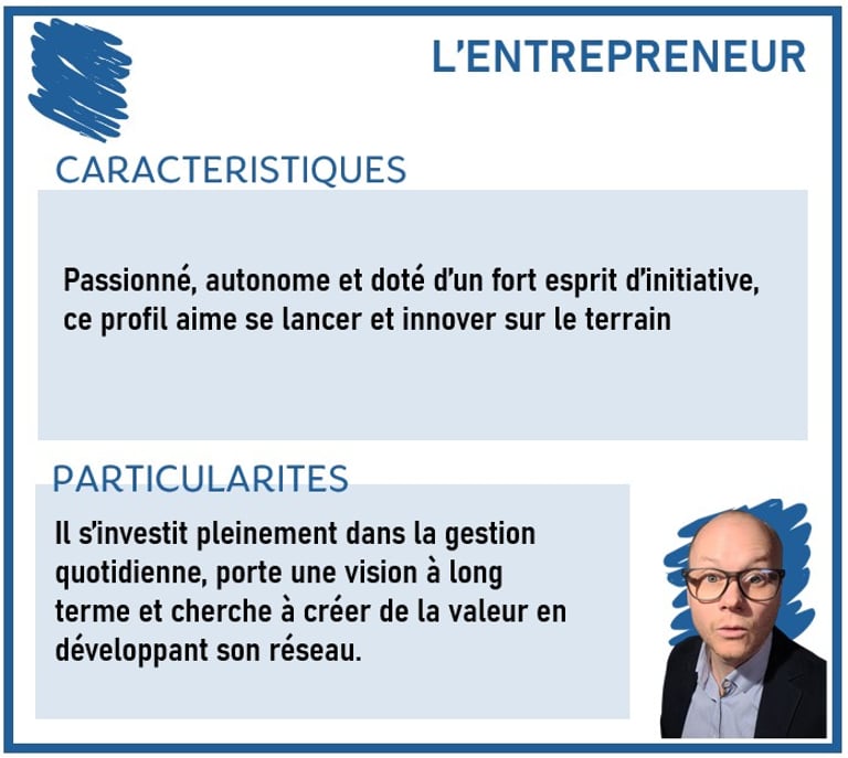 Caractéristiques :Passionné, autonome et doté d’un fort esprit d’initiative, ce profil aime se lancer et innover sur le terrain.Particularités :Il s’investit pleinement dans la gestion quotidienne, porte une vision à long terme et cherche à créer de la valeur en développant son réseau.