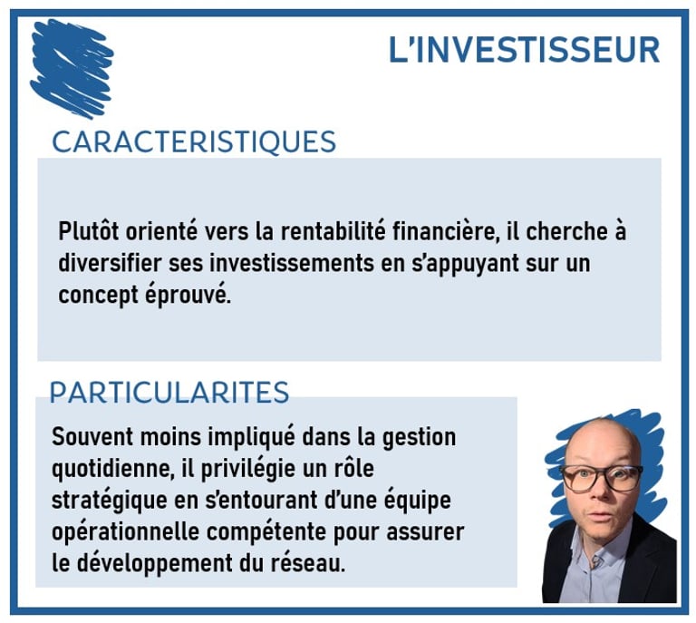 Caractéristiques :Plutôt orienté vers la rentabilité financière, il cherche à diversifier ses investissements en s’appuyant sur un concept éprouvé.Particularités :Souvent moins impliqué dans la gestion quotidienne, il privilégie un rôle stratégique en s’entourant d’une équipe opérationnelle compétente pour assurer le développement du réseau.